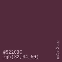 Цвет #522C3C в цветовой модели RGB обозначается тремя октетами (82, 44, 60) в десятичном формате и #522C3C в шестнадцатиричном (hex) формате, которые являются интенсивностью красного 82 (hex 52), интенсивность зелёного 44 (hex 2C) и интенсивность синего 60 (hex 3C).