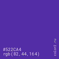 Цвет #522CA4 в цветовой модели RGB обозначается тремя октетами (82, 44, 164) в десятичном формате и #522CA4 в шестнадцатиричном (hex) формате, которые являются интенсивностью красного 82 (hex 52), интенсивность зелёного 44 (hex 2C) и интенсивность синего 164 (hex A4).