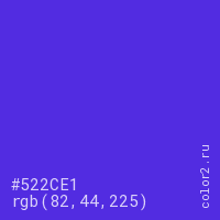 Цвет #522CE1 в цветовой модели RGB обозначается тремя октетами (82, 44, 225) в десятичном формате и #522CE1 в шестнадцатиричном (hex) формате, которые являются интенсивностью красного 82 (hex 52), интенсивность зелёного 44 (hex 2C) и интенсивность синего 225 (hex E1).