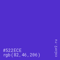 Цвет #522ECE в цветовой модели RGB обозначается тремя октетами (82, 46, 206) в десятичном формате и #522ECE в шестнадцатиричном (hex) формате, которые являются интенсивностью красного 82 (hex 52), интенсивность зелёного 46 (hex 2E) и интенсивность синего 206 (hex CE).
