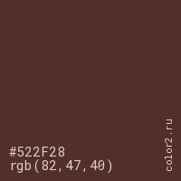 Цвет #522F28 в цветовой модели RGB обозначается тремя октетами (82, 47, 40) в десятичном формате и #522F28 в шестнадцатиричном (hex) формате, которые являются интенсивностью красного 82 (hex 52), интенсивность зелёного 47 (hex 2F) и интенсивность синего 40 (hex 28).