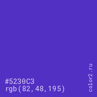 Цвет #5230C3 в цветовой модели RGB обозначается тремя октетами (82, 48, 195) в десятичном формате и #5230C3 в шестнадцатиричном (hex) формате, которые являются интенсивностью красного 82 (hex 52), интенсивность зелёного 48 (hex 30) и интенсивность синего 195 (hex C3).