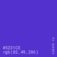 Цвет #5231CE в цветовой модели RGB обозначается тремя октетами (82, 49, 206) в десятичном формате и #5231CE в шестнадцатиричном (hex) формате, которые являются интенсивностью красного 82 (hex 52), интенсивность зелёного 49 (hex 31) и интенсивность синего 206 (hex CE).