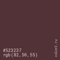 Цвет #523237 в цветовой модели RGB обозначается тремя октетами (82, 50, 55) в десятичном формате и #523237 в шестнадцатиричном (hex) формате, которые являются интенсивностью красного 82 (hex 52), интенсивность зелёного 50 (hex 32) и интенсивность синего 55 (hex 37).