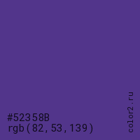 Цвет #52358B в цветовой модели RGB обозначается тремя октетами (82, 53, 139) в десятичном формате и #52358B в шестнадцатиричном (hex) формате, которые являются интенсивностью красного 82 (hex 52), интенсивность зелёного 53 (hex 35) и интенсивность синего 139 (hex 8B).