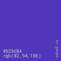 Цвет #5236BA в цветовой модели RGB обозначается тремя октетами (82, 54, 186) в десятичном формате и #5236BA в шестнадцатиричном (hex) формате, которые являются интенсивностью красного 82 (hex 52), интенсивность зелёного 54 (hex 36) и интенсивность синего 186 (hex BA).
