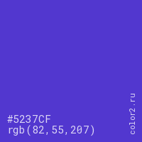 Цвет #5237CF в цветовой модели RGB обозначается тремя октетами (82, 55, 207) в десятичном формате и #5237CF в шестнадцатиричном (hex) формате, которые являются интенсивностью красного 82 (hex 52), интенсивность зелёного 55 (hex 37) и интенсивность синего 207 (hex CF).
