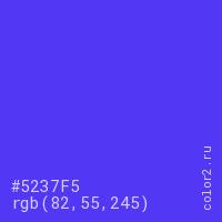 Цвет #5237F5 в цветовой модели RGB обозначается тремя октетами (82, 55, 245) в десятичном формате и #5237F5 в шестнадцатиричном (hex) формате, которые являются интенсивностью красного 82 (hex 52), интенсивность зелёного 55 (hex 37) и интенсивность синего 245 (hex F5).