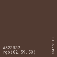 Цвет #523B32 в цветовой модели RGB обозначается тремя октетами (82, 59, 50) в десятичном формате и #523B32 в шестнадцатиричном (hex) формате, которые являются интенсивностью красного 82 (hex 52), интенсивность зелёного 59 (hex 3B) и интенсивность синего 50 (hex 32).
