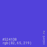 Цвет #5241DB в цветовой модели RGB обозначается тремя октетами (82, 65, 219) в десятичном формате и #5241DB в шестнадцатиричном (hex) формате, которые являются интенсивностью красного 82 (hex 52), интенсивность зелёного 65 (hex 41) и интенсивность синего 219 (hex DB).