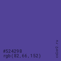 Цвет #524298 в цветовой модели RGB обозначается тремя октетами (82, 66, 152) в десятичном формате и #524298 в шестнадцатиричном (hex) формате, которые являются интенсивностью красного 82 (hex 52), интенсивность зелёного 66 (hex 42) и интенсивность синего 152 (hex 98).