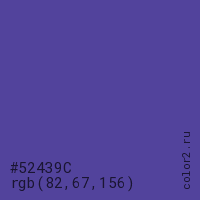 Цвет #52439C в цветовой модели RGB обозначается тремя октетами (82, 67, 156) в десятичном формате и #52439C в шестнадцатиричном (hex) формате, которые являются интенсивностью красного 82 (hex 52), интенсивность зелёного 67 (hex 43) и интенсивность синего 156 (hex 9C).