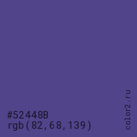 Цвет #52448B в цветовой модели RGB обозначается тремя октетами (82, 68, 139) в десятичном формате и #52448B в шестнадцатиричном (hex) формате, которые являются интенсивностью красного 82 (hex 52), интенсивность зелёного 68 (hex 44) и интенсивность синего 139 (hex 8B).