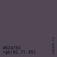 Цвет #524755 в цветовой модели RGB обозначается тремя октетами (82, 71, 85) в десятичном формате и #524755 в шестнадцатиричном (hex) формате, которые являются интенсивностью красного 82 (hex 52), интенсивность зелёного 71 (hex 47) и интенсивность синего 85 (hex 55).