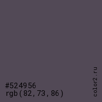 Цвет #524956 в цветовой модели RGB обозначается тремя октетами (82, 73, 86) в десятичном формате и #524956 в шестнадцатиричном (hex) формате, которые являются интенсивностью красного 82 (hex 52), интенсивность зелёного 73 (hex 49) и интенсивность синего 86 (hex 56).