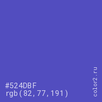 Цвет #524DBF в цветовой модели RGB обозначается тремя октетами (82, 77, 191) в десятичном формате и #524DBF в шестнадцатиричном (hex) формате, которые являются интенсивностью красного 82 (hex 52), интенсивность зелёного 77 (hex 4D) и интенсивность синего 191 (hex BF).