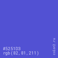 Цвет #5251D3 в цветовой модели RGB обозначается тремя октетами (82, 81, 211) в десятичном формате и #5251D3 в шестнадцатиричном (hex) формате, которые являются интенсивностью красного 82 (hex 52), интенсивность зелёного 81 (hex 51) и интенсивность синего 211 (hex D3).