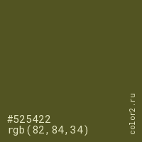 Цвет #525422 в цветовой модели RGB обозначается тремя октетами (82, 84, 34) в десятичном формате и #525422 в шестнадцатиричном (hex) формате, которые являются интенсивностью красного 82 (hex 52), интенсивность зелёного 84 (hex 54) и интенсивность синего 34 (hex 22).