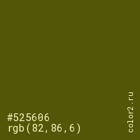 Цвет #525606 в цветовой модели RGB обозначается тремя октетами (82, 86, 6) в десятичном формате и #525606 в шестнадцатиричном (hex) формате, которые являются интенсивностью красного 82 (hex 52), интенсивность зелёного 86 (hex 56) и интенсивность синего 6 (hex 06).