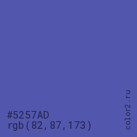 Цвет #5257AD в цветовой модели RGB обозначается тремя октетами (82, 87, 173) в десятичном формате и #5257AD в шестнадцатиричном (hex) формате, которые являются интенсивностью красного 82 (hex 52), интенсивность зелёного 87 (hex 57) и интенсивность синего 173 (hex AD).