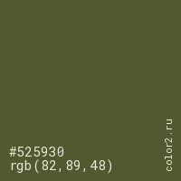 Цвет #525930 в цветовой модели RGB обозначается тремя октетами (82, 89, 48) в десятичном формате и #525930 в шестнадцатиричном (hex) формате, которые являются интенсивностью красного 82 (hex 52), интенсивность зелёного 89 (hex 59) и интенсивность синего 48 (hex 30).