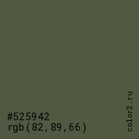 Цвет #525942 в цветовой модели RGB обозначается тремя октетами (82, 89, 66) в десятичном формате и #525942 в шестнадцатиричном (hex) формате, которые являются интенсивностью красного 82 (hex 52), интенсивность зелёного 89 (hex 59) и интенсивность синего 66 (hex 42).