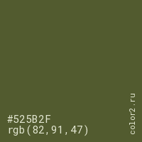 Цвет #525B2F в цветовой модели RGB обозначается тремя октетами (82, 91, 47) в десятичном формате и #525B2F в шестнадцатиричном (hex) формате, которые являются интенсивностью красного 82 (hex 52), интенсивность зелёного 91 (hex 5B) и интенсивность синего 47 (hex 2F).