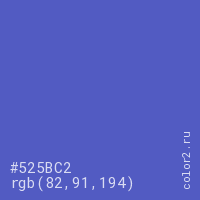 Цвет #525BC2 в цветовой модели RGB обозначается тремя октетами (82, 91, 194) в десятичном формате и #525BC2 в шестнадцатиричном (hex) формате, которые являются интенсивностью красного 82 (hex 52), интенсивность зелёного 91 (hex 5B) и интенсивность синего 194 (hex C2).