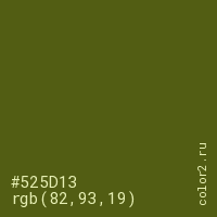 Цвет #525D13 в цветовой модели RGB обозначается тремя октетами (82, 93, 19) в десятичном формате и #525D13 в шестнадцатиричном (hex) формате, которые являются интенсивностью красного 82 (hex 52), интенсивность зелёного 93 (hex 5D) и интенсивность синего 19 (hex 13).
