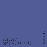 Цвет #525D97 в цветовой модели RGB обозначается тремя октетами (82, 93, 151) в десятичном формате и #525D97 в шестнадцатиричном (hex) формате, которые являются интенсивностью красного 82 (hex 52), интенсивность зелёного 93 (hex 5D) и интенсивность синего 151 (hex 97).