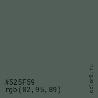 Цвет #525F59 в цветовой модели RGB обозначается тремя октетами (82, 95, 89) в десятичном формате и #525F59 в шестнадцатиричном (hex) формате, которые являются интенсивностью красного 82 (hex 52), интенсивность зелёного 95 (hex 5F) и интенсивность синего 89 (hex 59).