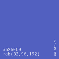 Цвет #5260C0 в цветовой модели RGB обозначается тремя октетами (82, 96, 192) в десятичном формате и #5260C0 в шестнадцатиричном (hex) формате, которые являются интенсивностью красного 82 (hex 52), интенсивность зелёного 96 (hex 60) и интенсивность синего 192 (hex C0).