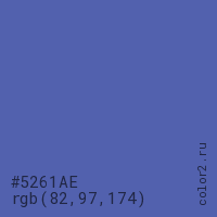 Цвет #5261AE в цветовой модели RGB обозначается тремя октетами (82, 97, 174) в десятичном формате и #5261AE в шестнадцатиричном (hex) формате, которые являются интенсивностью красного 82 (hex 52), интенсивность зелёного 97 (hex 61) и интенсивность синего 174 (hex AE).