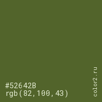 Цвет #52642B в цветовой модели RGB обозначается тремя октетами (82, 100, 43) в десятичном формате и #52642B в шестнадцатиричном (hex) формате, которые являются интенсивностью красного 82 (hex 52), интенсивность зелёного 100 (hex 64) и интенсивность синего 43 (hex 2B).