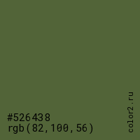 Цвет #526438 в цветовой модели RGB обозначается тремя октетами (82, 100, 56) в десятичном формате и #526438 в шестнадцатиричном (hex) формате, которые являются интенсивностью красного 82 (hex 52), интенсивность зелёного 100 (hex 64) и интенсивность синего 56 (hex 38).