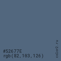 Цвет #52677E в цветовой модели RGB обозначается тремя октетами (82, 103, 126) в десятичном формате и #52677E в шестнадцатиричном (hex) формате, которые являются интенсивностью красного 82 (hex 52), интенсивность зелёного 103 (hex 67) и интенсивность синего 126 (hex 7E).