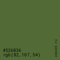 Цвет #526B36 в цветовой модели RGB обозначается тремя октетами (82, 107, 54) в десятичном формате и #526B36 в шестнадцатиричном (hex) формате, которые являются интенсивностью красного 82 (hex 52), интенсивность зелёного 107 (hex 6B) и интенсивность синего 54 (hex 36).