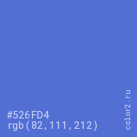 Цвет #526FD4 в цветовой модели RGB обозначается тремя октетами (82, 111, 212) в десятичном формате и #526FD4 в шестнадцатиричном (hex) формате, которые являются интенсивностью красного 82 (hex 52), интенсивность зелёного 111 (hex 6F) и интенсивность синего 212 (hex D4).