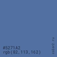 Цвет #5271A2 в цветовой модели RGB обозначается тремя октетами (82, 113, 162) в десятичном формате и #5271A2 в шестнадцатиричном (hex) формате, которые являются интенсивностью красного 82 (hex 52), интенсивность зелёного 113 (hex 71) и интенсивность синего 162 (hex A2).