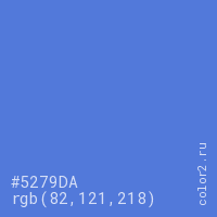 Цвет #5279DA в цветовой модели RGB обозначается тремя октетами (82, 121, 218) в десятичном формате и #5279DA в шестнадцатиричном (hex) формате, которые являются интенсивностью красного 82 (hex 52), интенсивность зелёного 121 (hex 79) и интенсивность синего 218 (hex DA).