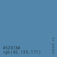 Цвет #5287AB в цветовой модели RGB обозначается тремя октетами (82, 135, 171) в десятичном формате и #5287AB в шестнадцатиричном (hex) формате, которые являются интенсивностью красного 82 (hex 52), интенсивность зелёного 135 (hex 87) и интенсивность синего 171 (hex AB).
