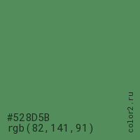 Цвет #528D5B в цветовой модели RGB обозначается тремя октетами (82, 141, 91) в десятичном формате и #528D5B в шестнадцатиричном (hex) формате, которые являются интенсивностью красного 82 (hex 52), интенсивность зелёного 141 (hex 8D) и интенсивность синего 91 (hex 5B).