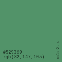 Цвет #529369 в цветовой модели RGB обозначается тремя октетами (82, 147, 105) в десятичном формате и #529369 в шестнадцатиричном (hex) формате, которые являются интенсивностью красного 82 (hex 52), интенсивность зелёного 147 (hex 93) и интенсивность синего 105 (hex 69).