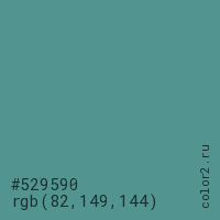 Цвет #529590 в цветовой модели RGB обозначается тремя октетами (82, 149, 144) в десятичном формате и #529590 в шестнадцатиричном (hex) формате, которые являются интенсивностью красного 82 (hex 52), интенсивность зелёного 149 (hex 95) и интенсивность синего 144 (hex 90).