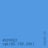 Цвет #5299E2 в цветовой модели RGB обозначается тремя октетами (82, 153, 226) в десятичном формате и #5299E2 в шестнадцатиричном (hex) формате, которые являются интенсивностью красного 82 (hex 52), интенсивность зелёного 153 (hex 99) и интенсивность синего 226 (hex E2).
