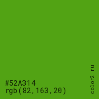 Цвет #52A314 в цветовой модели RGB обозначается тремя октетами (82, 163, 20) в десятичном формате и #52A314 в шестнадцатиричном (hex) формате, которые являются интенсивностью красного 82 (hex 52), интенсивность зелёного 163 (hex A3) и интенсивность синего 20 (hex 14).