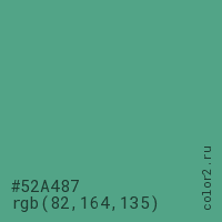 Цвет #52A487 в цветовой модели RGB обозначается тремя октетами (82, 164, 135) в десятичном формате и #52A487 в шестнадцатиричном (hex) формате, которые являются интенсивностью красного 82 (hex 52), интенсивность зелёного 164 (hex A4) и интенсивность синего 135 (hex 87).