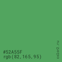 Цвет #52A55F в цветовой модели RGB обозначается тремя октетами (82, 165, 95) в десятичном формате и #52A55F в шестнадцатиричном (hex) формате, которые являются интенсивностью красного 82 (hex 52), интенсивность зелёного 165 (hex A5) и интенсивность синего 95 (hex 5F).
