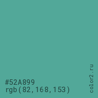 Цвет #52A899 в цветовой модели RGB обозначается тремя октетами (82, 168, 153) в десятичном формате и #52A899 в шестнадцатиричном (hex) формате, которые являются интенсивностью красного 82 (hex 52), интенсивность зелёного 168 (hex A8) и интенсивность синего 153 (hex 99).