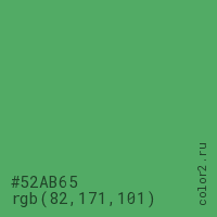 Цвет #52AB65 в цветовой модели RGB обозначается тремя октетами (82, 171, 101) в десятичном формате и #52AB65 в шестнадцатиричном (hex) формате, которые являются интенсивностью красного 82 (hex 52), интенсивность зелёного 171 (hex AB) и интенсивность синего 101 (hex 65).
